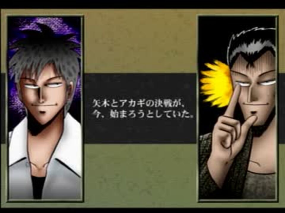 一方、重苦しい空気に包まれる仰木と安岡。 しかしアカギは「勝負はまだ、俺は勝つつもりだ」と言う。 そして誰も予想がつかない展開に― 6回戦・東2局終了時 赤木失った血液 00cc 鷲巣5億7250万円 残り資金2750万円 アカギ、カンして待ちを減らすも、リンシャンカイホーツモの権利を得る。 274話 権利 リンシャンカイホーツモ、不発。 275話 罅 安岡、パーソーThat's because this tile is in the way!